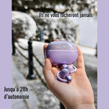 Une charge complÚte de vos écouteurs extra auriculaires permet d'écouter jusqu'à 28 heures de vos contenus préférés. Vous pouvez facilement vérifier le niveau de batterie grùce aux indicateurs LED situés sur le boßtier des écouteurs. Ces indicateurs vous offrent une visualisation claire du niveau de charge restant, vous permettant de savoir quand il est temps de recharger.