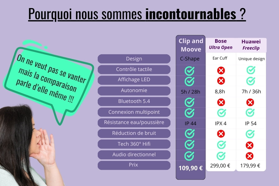 Nos écouteurs offrent une écoute immersive tout en permettant de rester connecté à son environnement. Leur design ergonomique évite qu'ils tombent et leur légÚreté les rend idéaux pour les activités sportives. De plus, ils offrent un confort accru et réduisent les risques liés à l'utilisation prolongée des écouteurs intra auriculaires.